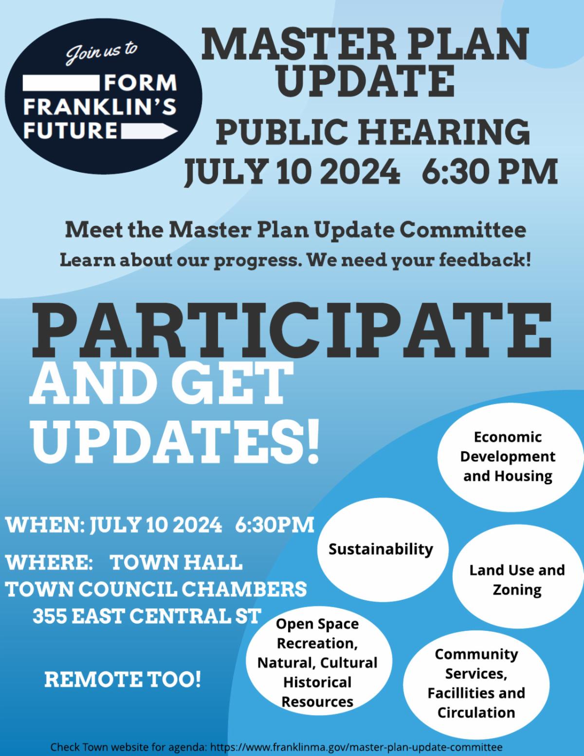 Wednesday, July 10, 6:30pm, Master Plan Update Committee Public Hearing. Status update with an opportunity for public input on the plan's goals and objectives. View in Town Council chambers or remotely through Cable Access TV, Zoom or streaming on YouTube. The Franklin Municipal Building is located at 355 E. Central Street. Select Master Plan for more information. Council chambers are on the 2nd floor.