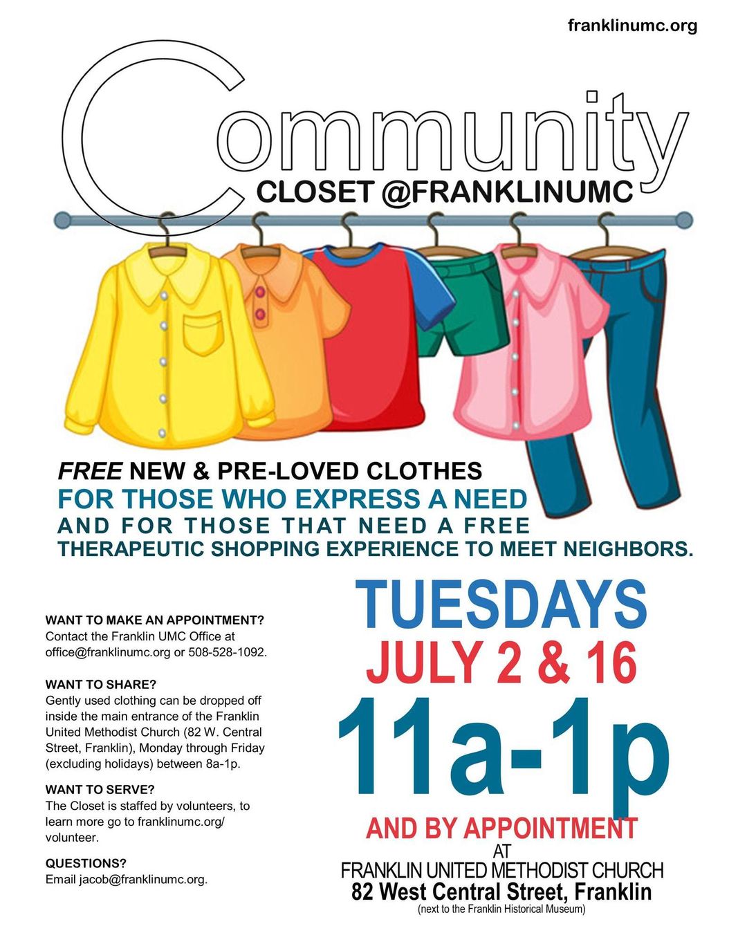 Tuesday, July 16, 11:00am to 1:00pm, Community Closet at Franklin United Methodist Church. Free new and pre-loved clothes for those who express a need and for those that need a free therapeutic shopping experience to meet neighbors. Select UMC for more information. Located at 82 W. Central Street.