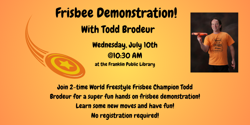 Wednesday, July 10, 10:30am, Frisbee Demonstration with Todd Brodeur at the Franklin Public Library. Join 2-time World Freestyle Frisbee Champion Todd Brodeur for a super fun hands on Frisbee demonstration! Learn some new moves and have fun! No registration required! Select Frisbee for information. Library is located at 118 Main Street.