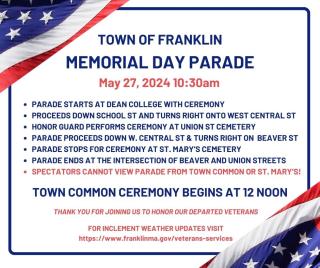 Monday, May 27, 10:30am, Town of Franklin, Memorial Day Parade. The parade will be followed by a Memorial Day Ceremony at noon on the Town Common by the War Memorial. All are welcome! Select Parade for parade route.