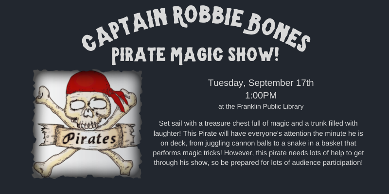 Tuesday September 17, 1:00 pm, Captain Robbie Bones Pirate Magic Show at the Franklin Public Library. Set sail with a treasure chest full of magic and a trunk filled with laughter! This Pirate will have everyone's attention the minute he is on deck, from juggling cannon balls to a snake in a basket that performs magic tricks! However, this pirate needs lots of help to get through his show, so be prepared for lots of audience participation! No registration required! Select Magic for information. The Library is located at 118 Main Street.