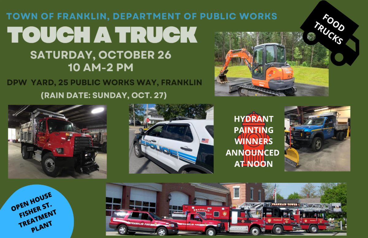 Saturday, October 26, 10:00 am to 2:00 pm DPW Touch-a-Truck in the DPW Yard, located at 25 Public Works Way. Hydrant Painting winners will be announced at noon. Open House Fisher Street Treatment Plant. Lots of vehicles. There will also be food trucks. Rain date 10/27. More information to follow.
