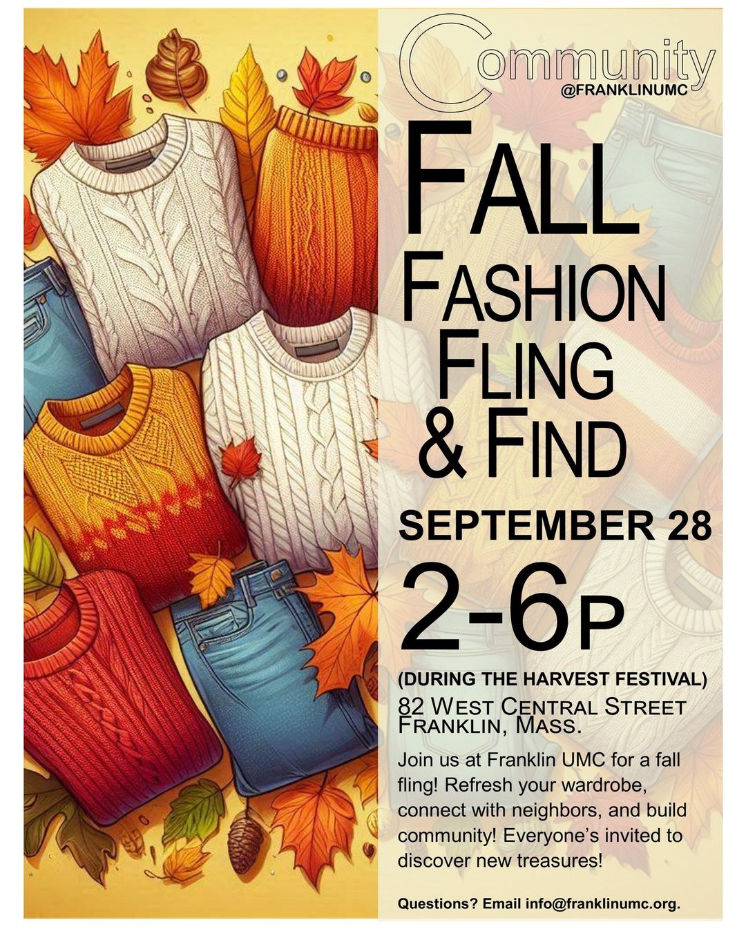 Saturday, September 28, 2:00 pm to 6:00 pm Fall Fashion Fling at United Methodist Church. Refresh your wardrobe, connect with neighbors, and build community! Everyone is invited. For more information email info@franklinumc.org. Located at 82 West Central Street.