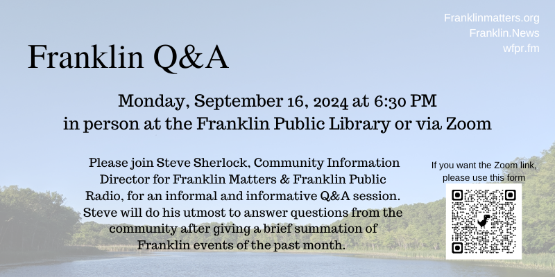 Monday, September 16, 6:30 pm Franklin Q & A at Franklin Public Library. Join Steve Sherlock, Community Information Director, for Franklin Matters & Franklin Public Radio (wfpr.fm), for an informal and informative Q&A session. Steve provides some updates on what's happened in the past month in the first 10-15 minutes, then opens the floor to answer whatever questions you have. In person or via zoom. Select QR square from image. The Library is located at 118 Main Street.