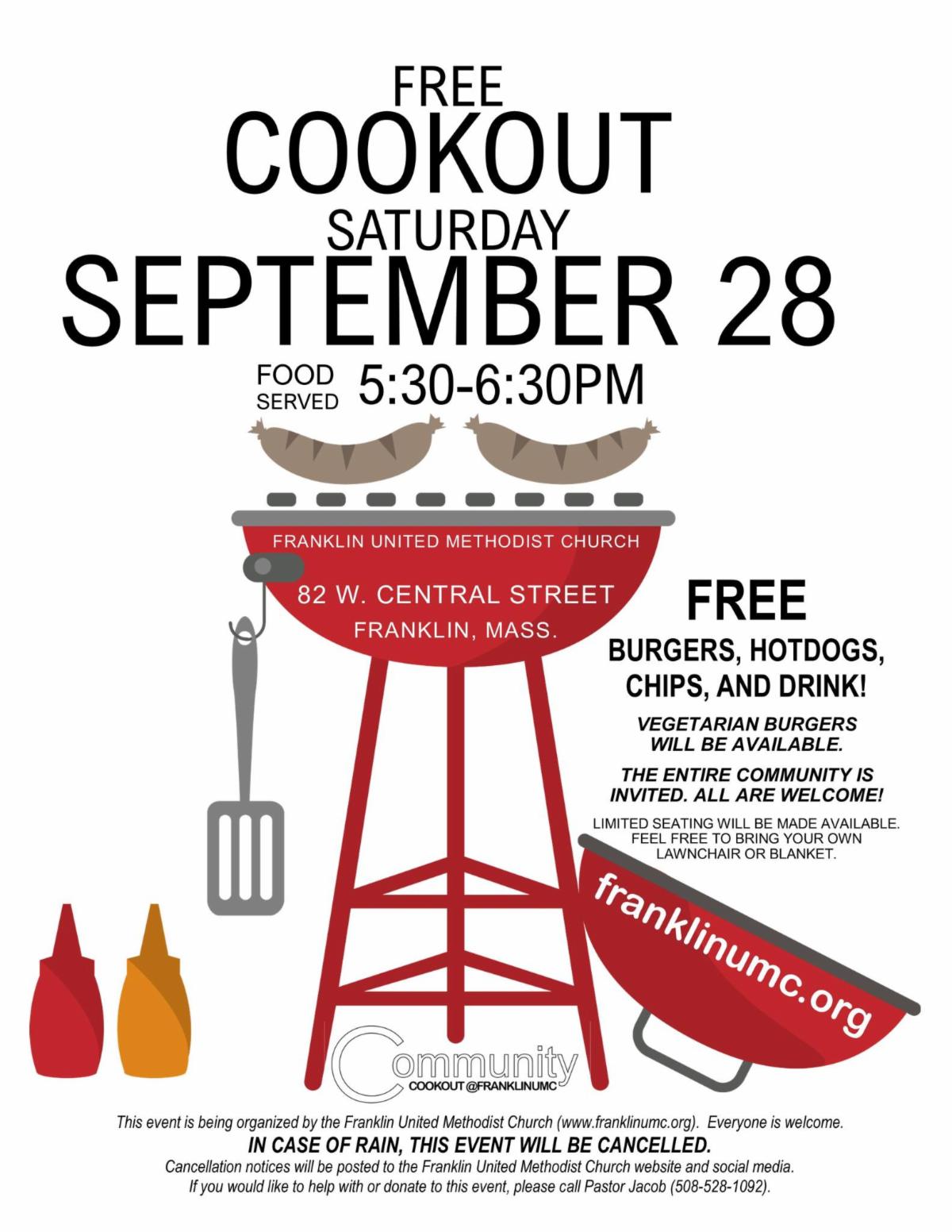 Saturday, September 28, 5:30 pm to 6:30 pm Free Cookout at Franklin United Methodist Church. Enjoy a Burger, Hot Dog, Chips and Drink. Vegetarian burgers will be available. In case of rain, event will be canceled. Select UMC for information. The Franklin United Methodist Church is located at 82 West Central Street.