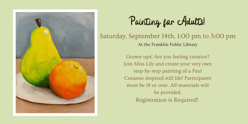 September 14, 1:00 pm to 3:00 pm, Painting for Adults at the Franklin Public Library. REGISTRATION REQUIRED. Grown Ups! Are you feeling creative? Join Miss Lily to create your own step-by-step painting of a Paul Cezanne inspi. red still life! All materials will be provided. Select Library for more information. Located at 118 Main Street.