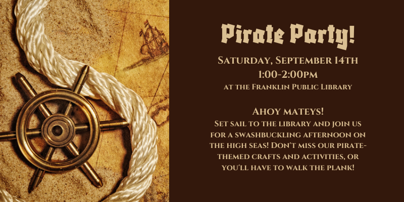 Saturday, September 14, 1:00 pm to 2:00 pm, Pirate Party at the Franklin Public Library. Ahoy mateys! Set sail to the library and join us for a swashbuckling afternoon on the high seas! Don't miss our pirate-themed crafts and activities, or you'll have to walk the plank! No registration required! Select Pirate for information. Library is located at 118 Main Street