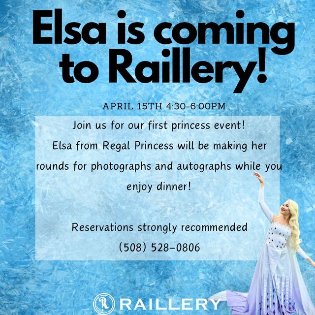 Monday, April 15, 4:30pm to 6:00pm, Princess Event at the Raillery. Elsa from Regal Princess will be making her rounds for photographs and autographs while you enjoy dinner. Select Raillery for information. Located at 280 Franklin Village Dr.