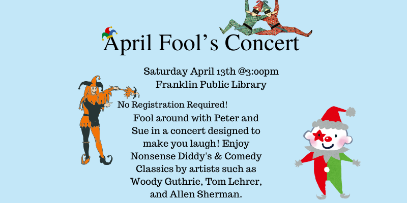 Saturday, April 13 at 3:00pm, April Fool’s Concert at Franklin Public Library. No Registration Required! Fool around with Peter and Sue in a concert designed to make you laugh! Enjoy Nonsense Diddy's & Comedy Classics by artists such as Woody Guthrie, Tom Lehrer, and Allen Sherman. Best for Adults and Teens. All ages welcome. Select Concert for information. The Library is located at 118 Main Street.