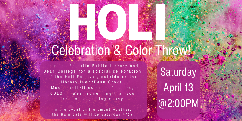 Saturday April 13, 2:00pm Holi Celebration! Franklin Public Library. Join the Franklin Public Library and Dean College for a special celebration of the Holi Festival, outside on the library lawn/Dean Grove! Music, activities, and of course, COLOR!! Wear something that you don't mind getting messy! Rain date 4/27. Select Holi for information. Located at 118 Main Street.