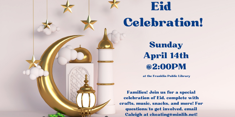 Sunday, April 14, 2:00pm Eid Celebration! Franklin Public Library. Families! Join us for a special celebration of Eid, complete with crafts, music, snacks, and more! For questions/to get involved, email Caleigh at ckeating@minlib.net! Library, 118 Main Street.