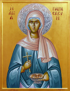 Saint Paraskeve, who was from a certain village near Rome, was born to pious parents, Agatho and Politia. Since she was born on a Friday (in Greek, Paraskeve), she was given this name, which means "preparation" or "preparedness" (compare Matt. 27:62, Mark 15:42, Luke 23:54, and John 19:31, where 'Friday' is called "the day of the preparation"). From childhood she was instructed in the sacred letters and devoted herself to the study of the divine Scriptures, while leading a monastic life and guiding many to the Faith of Christ. During the reign of the Emperor Antoninus Pius, she was apprehended because she was a Christian and was urged to worship the idols, but she answered with the words of Jeremias: "Let the gods that have not made heaven and the earth perish from off the earth" (Jer. 10:11). Because of this she endured exceedingly painful torments, and was beheaded in the year 140. The faithful pray to her for the healing of eye ailments.