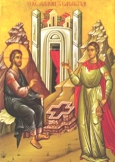 When our Lord Jesus Christ, then, came at midday to this city, which is also called Sychar (John 4:5), He was wearied from the journey and the heat, and He sat down at this well. After a little while the Samaritan woman mentioned in today's Gospel passage came to draw water. As she conversed at some length with the Lord and heard from Him secret things concerning herself, she believed in Him; through her many other Samaritans also believed.