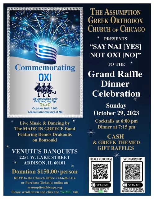 Sunday, October 29 - 6:00 p.m., Grand Raffle Dinner Celebration at Venuti’s Italian Restaurant & Banquet Hall, 2251 W. Lake Street, Addison, IL 60101. You may purchase tickets during the week, by contacting the church office at: (773) 626-3114. Tickets are also available every Sunday during the coffee hour in Plato Hall. Please see flyer for additional details.