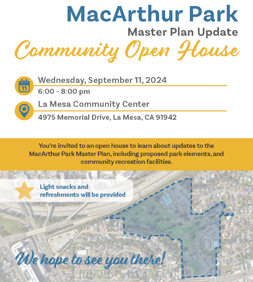 Mark your calendars! You're invited to a Community Open House on Wednesday, Sept. 11 from 6-8 p.m. at the La Mesa Community Center to learn more about the latest updates to the MacArthur Park Master Plan. | |