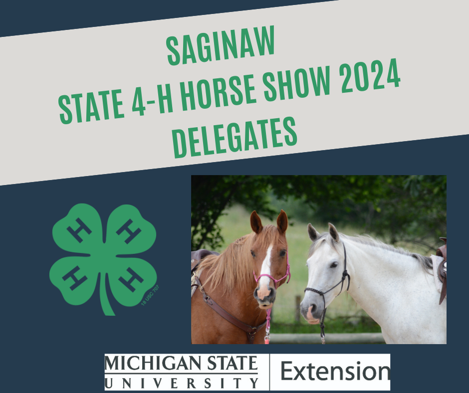 Congratulations to the Saginaw 4-H delegates representing Saginaw County in the 4-H State Horse August 16-18 2024! https://www.canr.msu.edu/events/michigan-4-h-state-horse-show-2024
