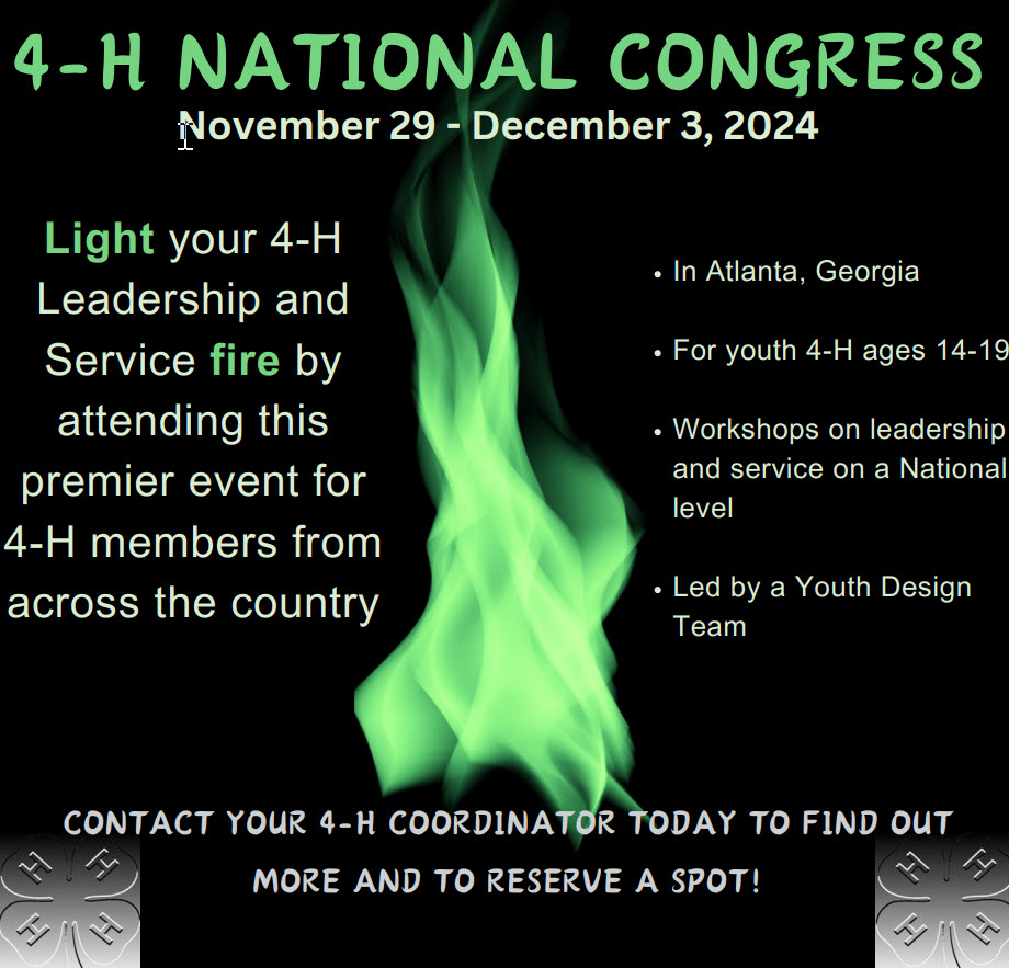 Participate in the 2024 National 4-H Congress November 29 – December 3, 2024 in Atlanta, Georgia! Michigan 4-H youth ages 14-19 are invited to attend this leadership, citizenship and community service event.