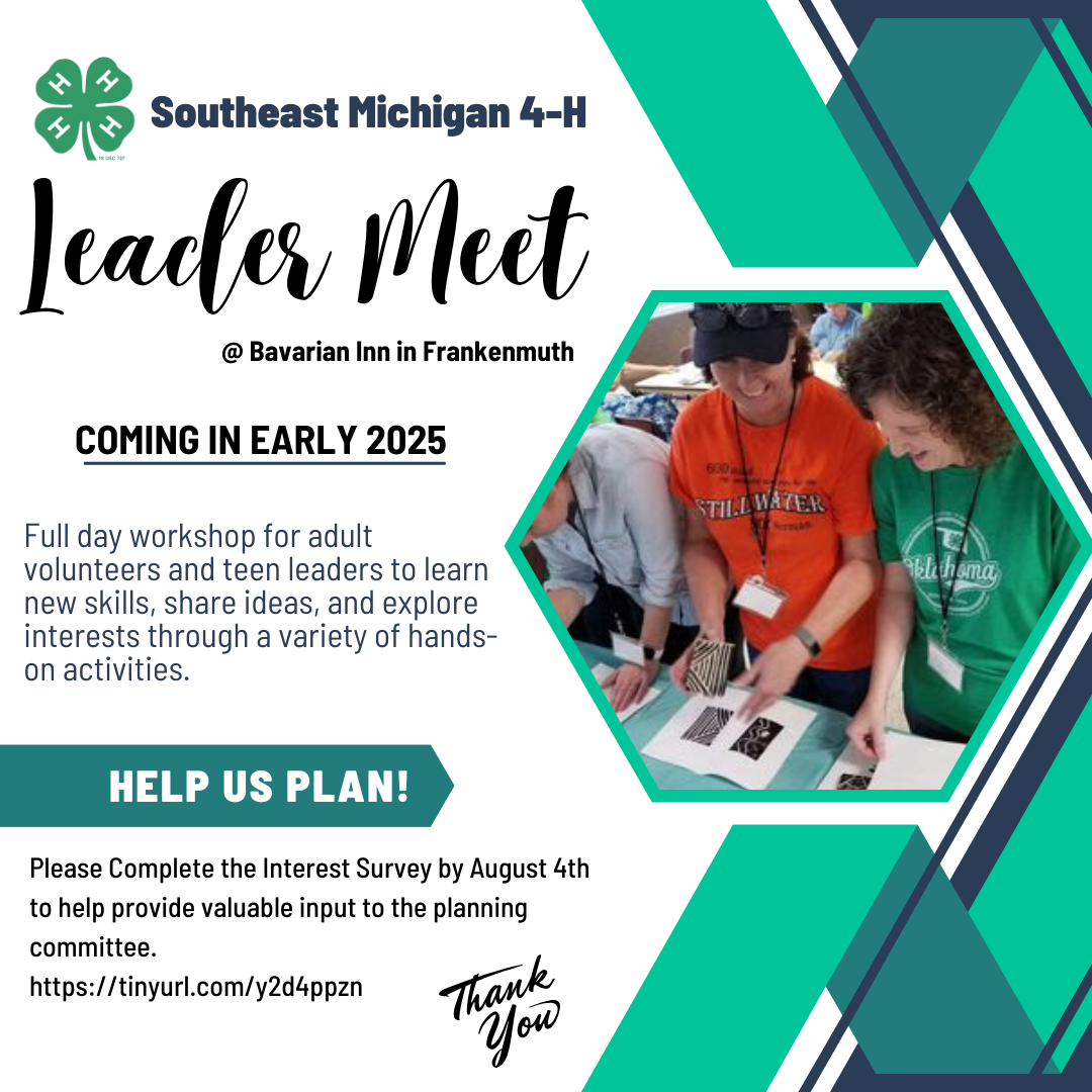 A 4-H Leader Meet is being planned for March 2025 and we want to know.... What do you want to learn about? What topics are you interested in? What project areas would you like to hear more about? The planning of this event is moving forward with a tentative event date in March at the Bavarian Inn in Frankenmuth.
