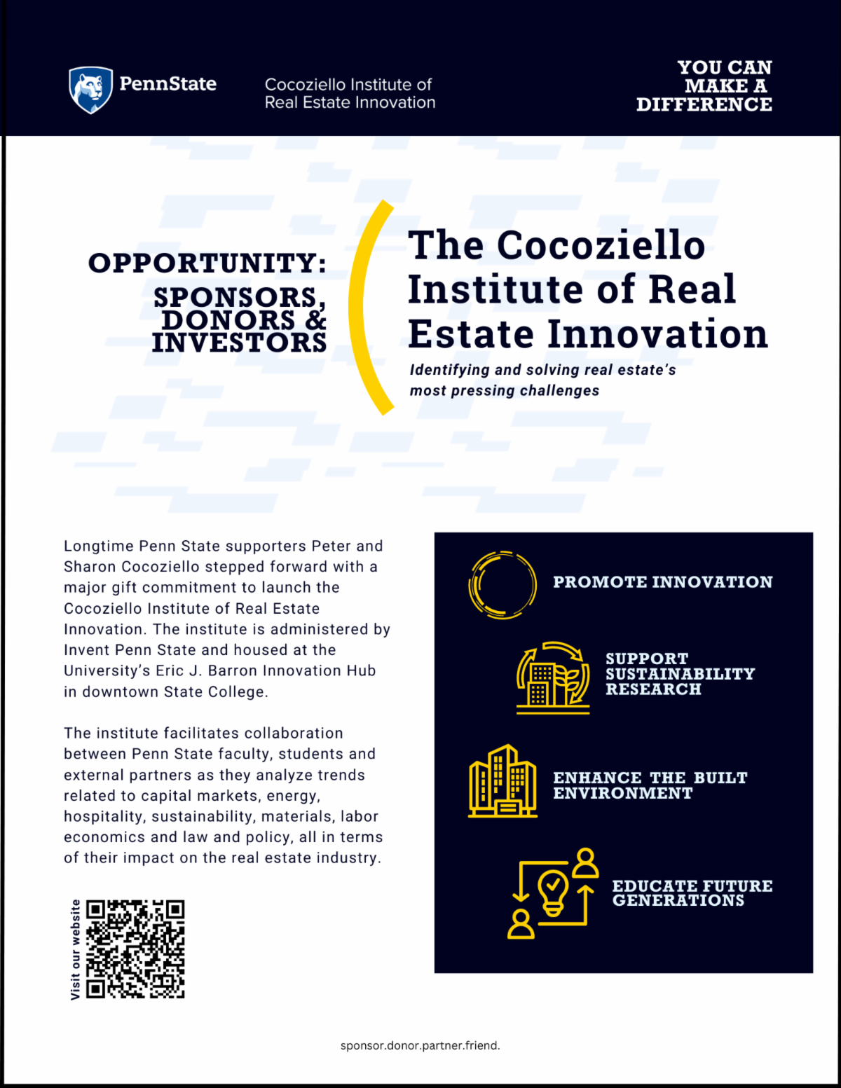 Partner with or sponsor the Cocoziello Institute of Real Estate Innovation! We are dedicated to advancing the real estate industry through cross-disciplinary collaboration and education. Connecting industry experts with Penn State’s world-class interdisciplinary research institutes and academic colleges that intersect with real estate, we strive to identify and develop new solutions that improve the built environment, enhance the well-being of its occupants, and support sustainable development.