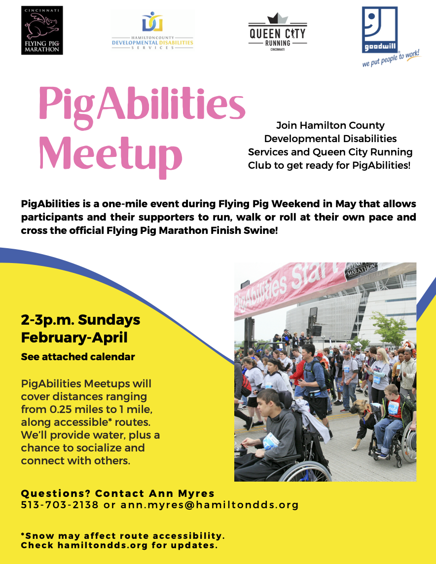 Hamilton County DDS, in partnership with Queen City Running Club is hosting a group to help people get ready for PigAbilities, a one-mile event during Flying Pig Weekend in May. The event allows participants and their supporters to run, walk, or roll at their own pace and cross the official Flying Pig Marathon Finish Swine! These Meetups are open to everyone who wants to practice, fit with water and a chance to socialize with others who may participate in the PigAbilities event.