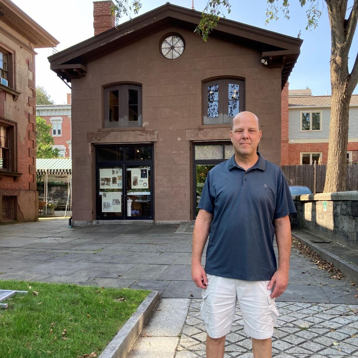 While we continue to search for photos of domestic staff from their time at Victoria Mansion, we're so glad to have this photo of Keith in front of the Carriage House where his great-grandfather lived and worked. Thank you for visiting, Keith and Mary!