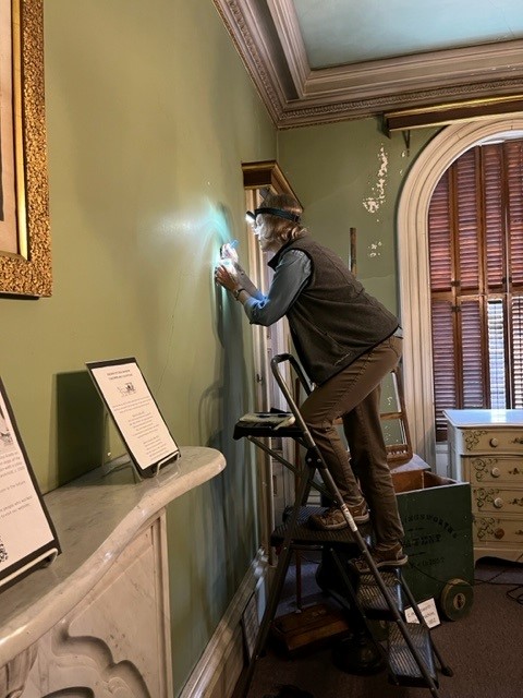 On September 25th, we were pleased to welcome Amy Cole Ives of Sutherland Conservation & Consulting in Hallowell, ME for a look at the painted surfaces in the Girls Room on the second floor of the Mansion. She and Executive Director Tim Brosnihan inspected several areas on the walls and part of the ceiling to determine the best place to take a paint sample. Amy will be analyzing the layers of paint and plaster to determine if the green paint appears to be original to the house's design or a later overpainting. This analysis will be an important step in helping us learn more about the Girls Room's original use, and how best to conduct conservation and restoration in the room in the future.