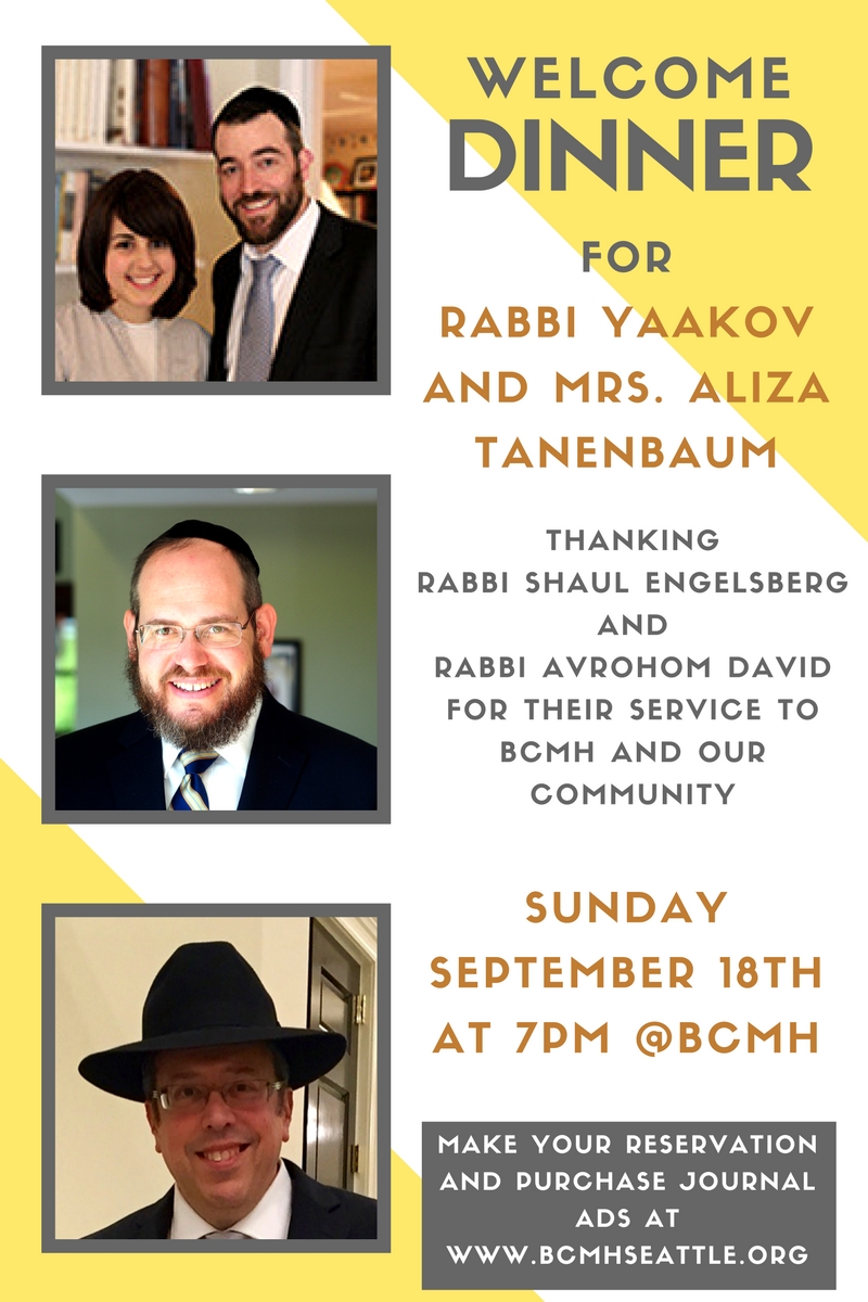 Join us as we welcome Rabbi Yaakov and Mrs. Aliza Tanenbaum and family to BCMH and to Seattle. Help us express our thanks Rabbi Avrohom David and Rabbi Shaul Engelsberg for all that they do for BCMH and the greater Seattle Community. Cocktails 7:00-8:00 pm with dinner promptly at 8:00 pm, BCMH Volotin Social Hall.