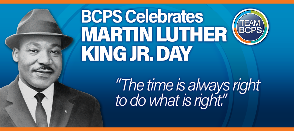 On Monday, January 16, BCPS schools and offices will be closed as we honor the life and legacy of Martin Luther King Jr. His contributions and service inspire us to create a more just, humane, equitable and peaceful world. Learning materials and resources are available in our Policy 6304 – Commemoration and Observances Schoology page.