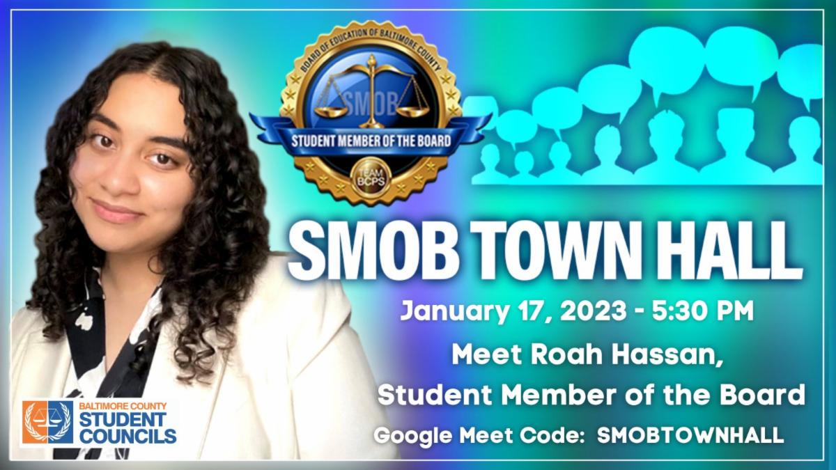 BCPS students are invited to our first SMOB Town Hall of the year on Tuesday, January 17, at 5:30 p.m. Meet Roah Hassan, our current SMOB, via Google Meets using code SMOBTOWNHALL. BCPS credentials are needed to join.