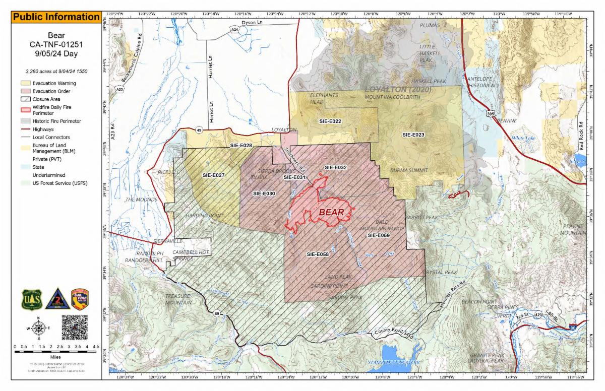 Sierra County: Evacuation order and warnings remain in effect. For an interactive map of evacuations, visit: https://protect.genasys.com/search. For updated information with evacuations, visit: http://sierracounty.ca.gov/853/Bear-Fire-2024.
