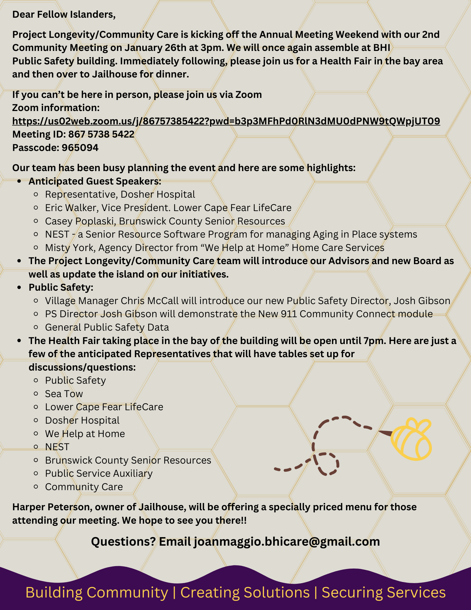 Join Project Longevity/Community Care for its second community meeting on Friday, January 26, at 3:00pm at the Public Safety Complex (273 Edward Teach Ext.). Following the meeting will be a Health Fair in the bay area, and then Harper Peterson, owner of Jailhouse Provisions (251 Edward Teach Ext.), will be offering a specially priced menu for those attending the meeting. For any questions, contact Joan Maggio at joanmaggio.bhicare@gmail.com.