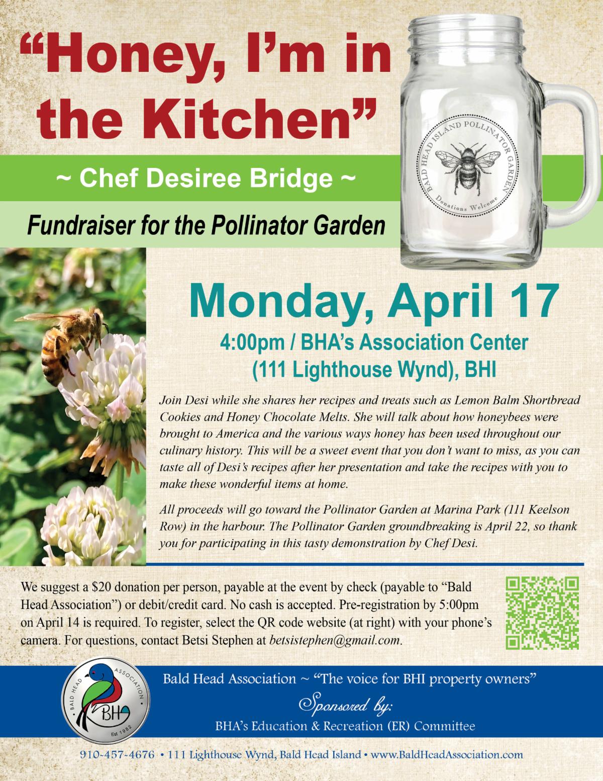 Join us for a tasty demonstration and talk by Chef Desiree on Monday, April 17, at 4:00pm at BHA's Association Center (111 Lighthouse Wynd). We suggest a $20 donation, and all proceeds will go toward the new Pollinator Garden at Marina Park (111 Keelson Row) in the harbour. Click on the poster for additional details and the QR link to register.