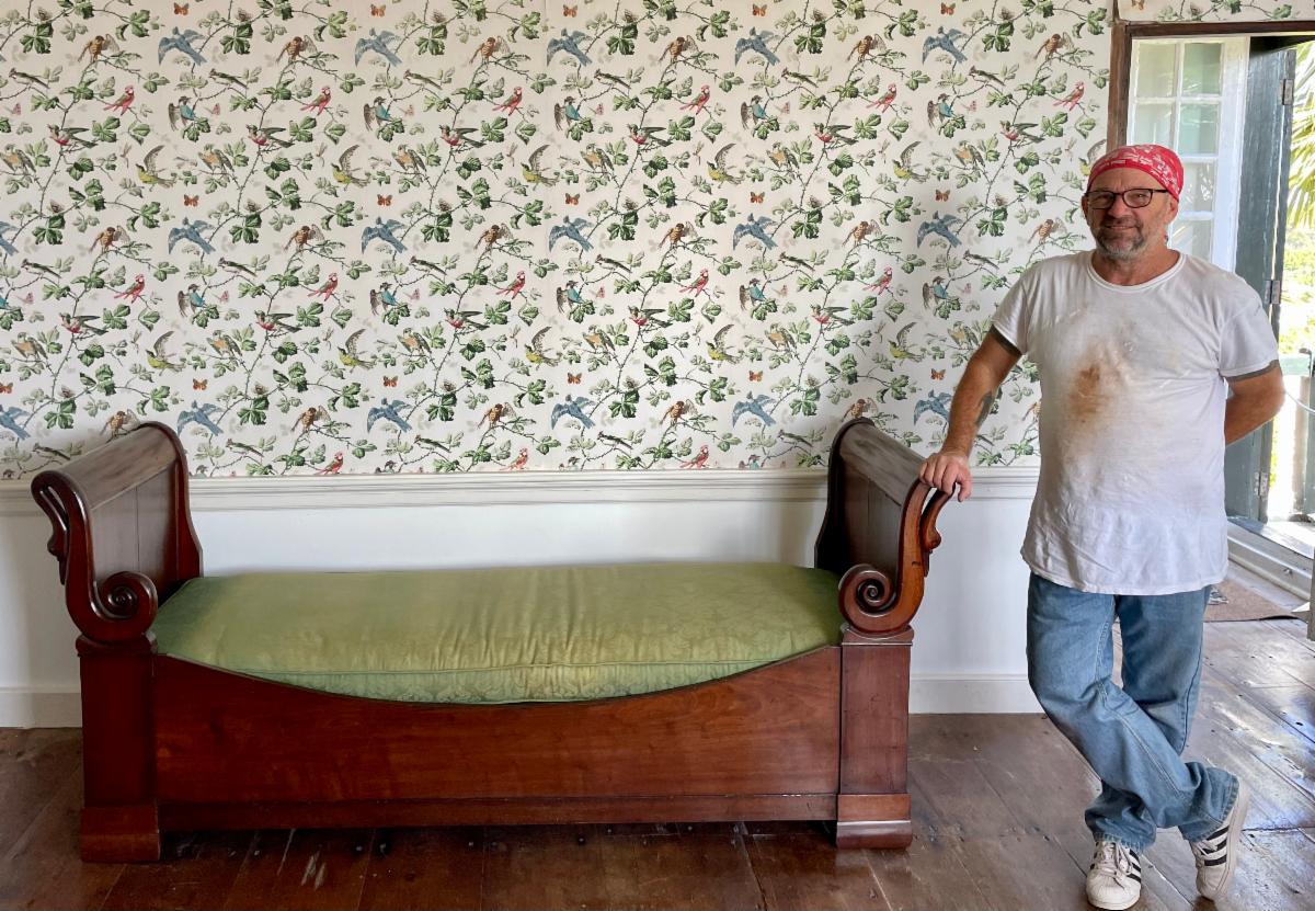 Furniture Collection Conservation | Professional conservator and restorer Andrew Mello has applied his expertise and skill to more pieces within the Trust’s antique furniture collection. These include several cedar pieces on display at Verdmont. Andrew has stabilised and repaired the extremely fragile legs of a cedar chest-on-stand that was barely able to stand. He also brought an important but disjointed and discoloured cedar chest back to life. A sleigh-style mahogany day bed with swan neck carvings is now reassembled and re-glued after it came apart. | |