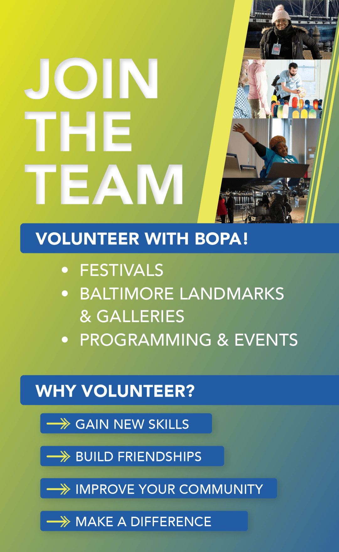 At BOPA, volunteers are essential to our mission. Join us to support Baltimore’s creative community and assist in our diverse programs — from flagship events like Artscape, Baltimore Book Festival, and The Baltimore Farmers' Market to special events like exhibitions and awards ceremonies. Volunteers are also often asked to serve as panelists for the many grant programs and prizes that BOPA manages. We welcome all backgrounds and life stages to apply. Click the button below for more information about BOPA's volunteer program and how to apply. | | |