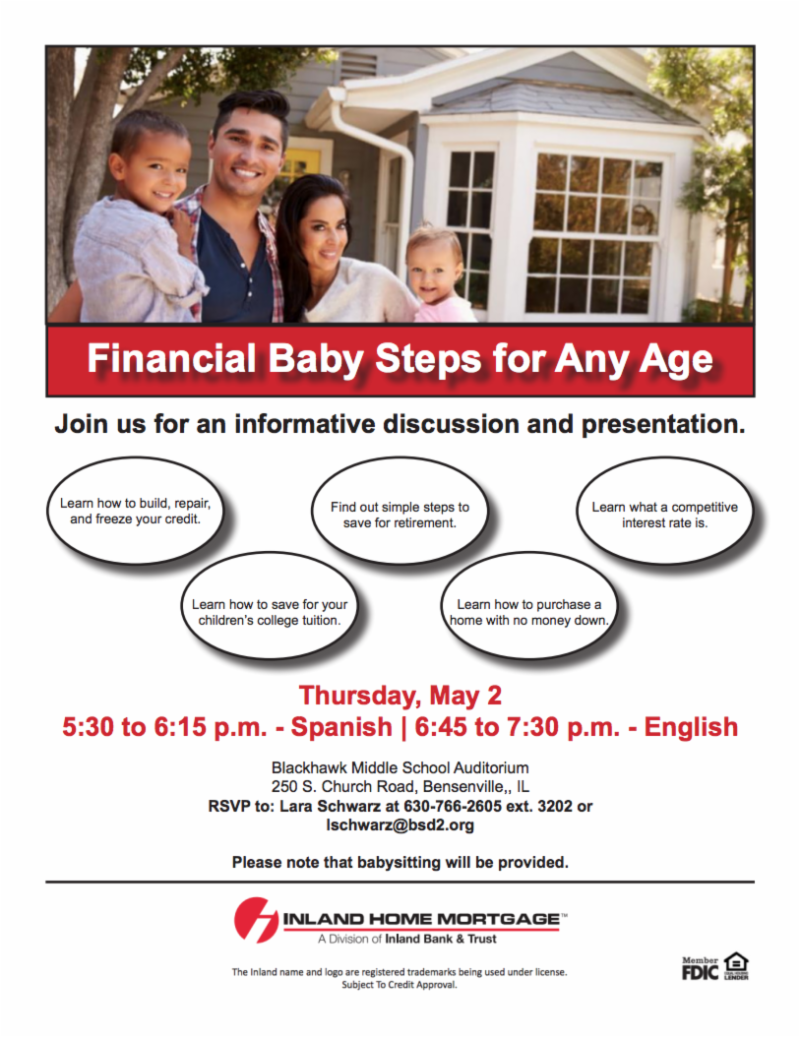 Inland will present "Financial Baby Steps for Any Age" twice on May 2 -- first in Spanish from 5:30-6:15 p.m., then in English from 6:45-7:30 p.m. Both presentation will be held in the auditorium at Blackhawk Middle School, located 250 S. Church Road in Bensenville.