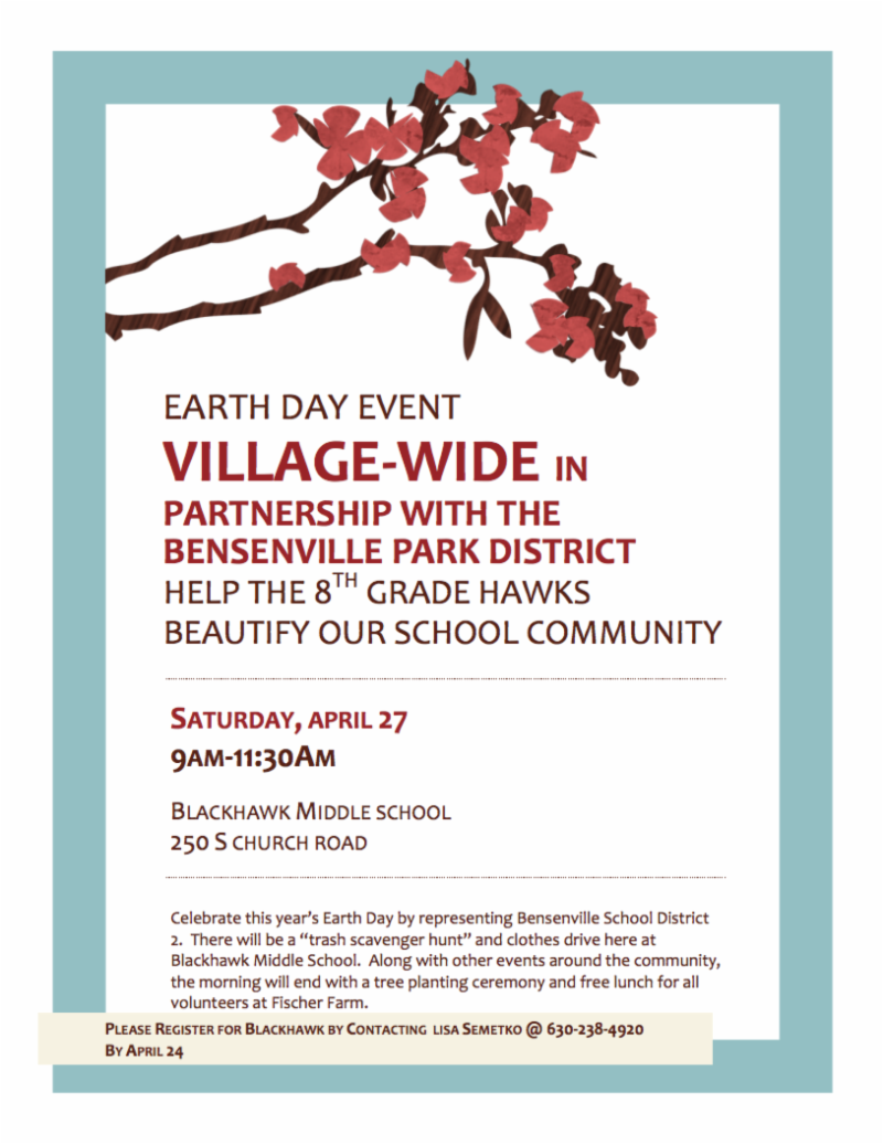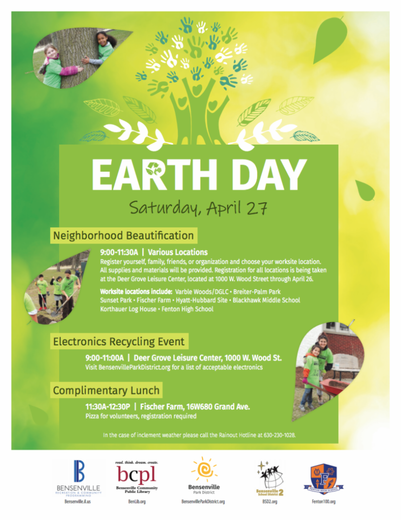 To celebrate Earth Day, the Village of Bensenville, Bensenville Community Public Library, Bensenville Park District, Bensenville School District 2, and Fenton High School are partnering to sponsor a variety of events around the community on Saturday, April 27.