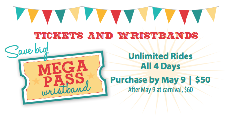 Mega Pass wristbands cost $50 if purchased by Thursday, May 9, or $60 at the gate, and provide unlimited rides for all four days of the carnival.