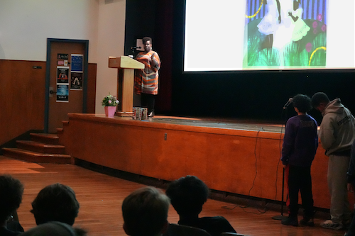 Renée Watson, autora de bestsellers del New York Times, visitó las escuelas Martin Luther King Jr. Middle School y Longfellow Middle School el 15 de febrero, donde compartió cómo sus experiencias vitales dieron forma a su obra y leyó poemas de su último libro, Black Girl You Are Atlas. Durante ambas charlas, los estudiantes tuvieron la oportunidad de hacer preguntas a los ponentes, desde qué les inspira hasta consejos concretos para sus propios proyectos de escritura. | Los estudiantes hicieron fila para preguntar a Renée acerca de su poesía favorita, su proceso de escritura y mucho más. | |