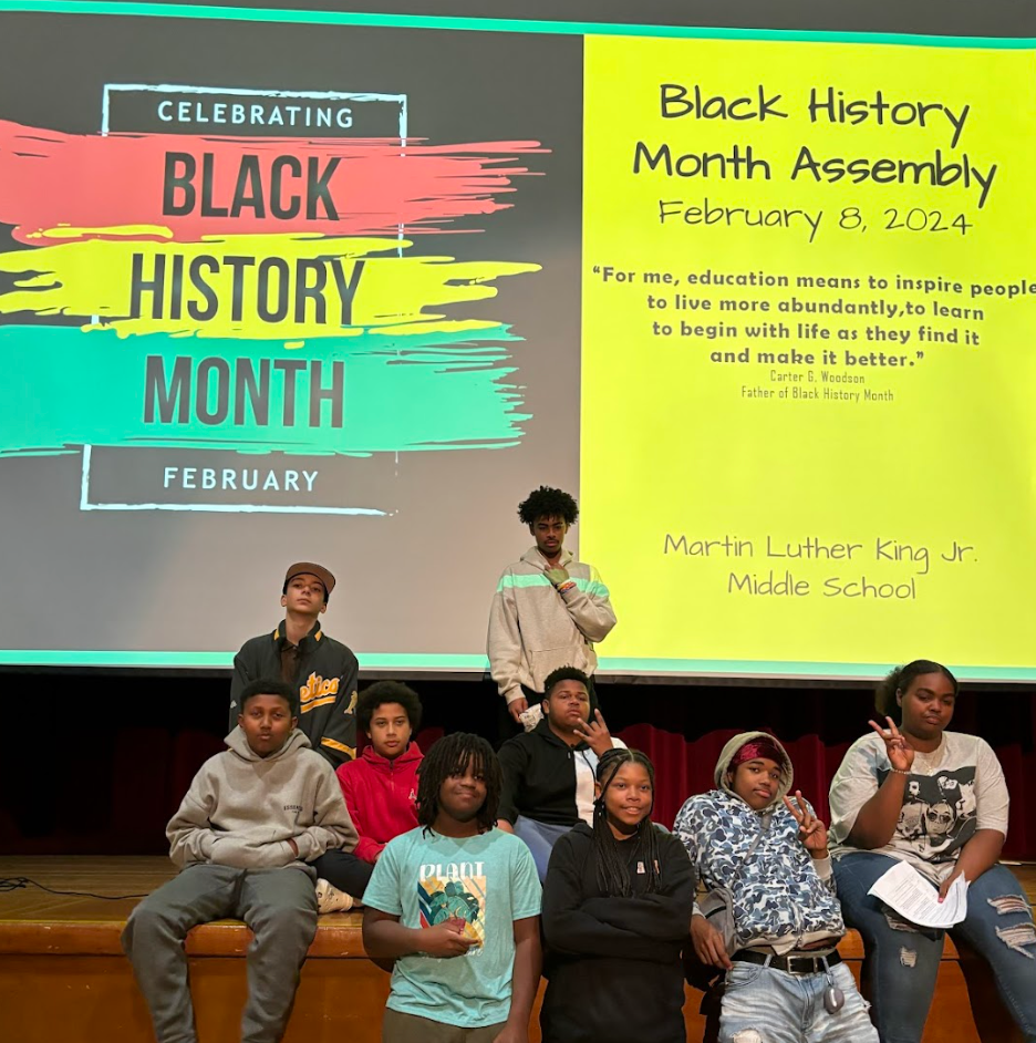 La Asamblea del Mes de la Historia Negra del 8 de febrero en la Escuela Secundaria Martin Luther King Jr. incluyó a varios oradores, presentadores y artistas estudiantiles y del personal. | |