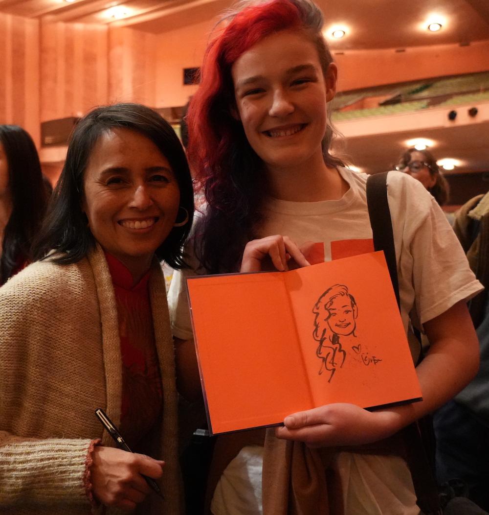 Mientras firmaba ejemplares de su libro, LeUyeun dibujó retratos de estudiantes en el momento. | |