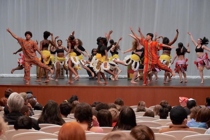 Bailarines de la clase de Danza de la Diáspora Africana actuaron con percusionistas en vivo en el Auditorio de Oxford. | La clase de Danza de la Diáspora Africana de Berkeley High School actuó para los Estudiantes de Oxford Elementary el 22 de febrero. Ellos interpretaron dos danzas, Sulu, una danza de celebración de Bali, y Kasunde, una danza inspirada en los movimientos del ganado. | |