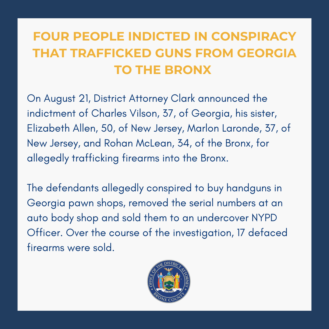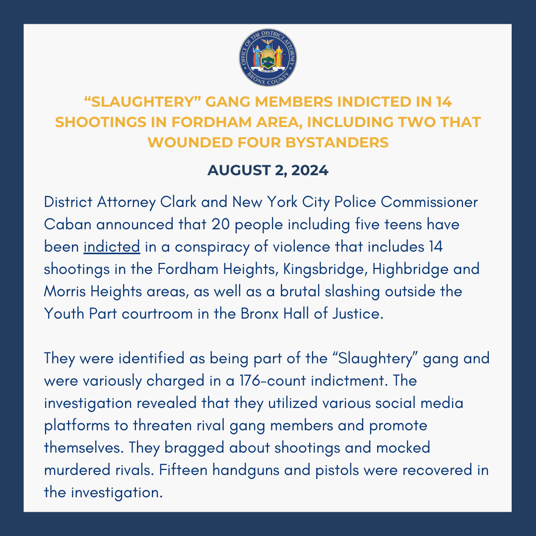 We continued our effort to make the Bronx safer, with prosecutions of alleged fraudsters, violent gang members and gun traffickers.