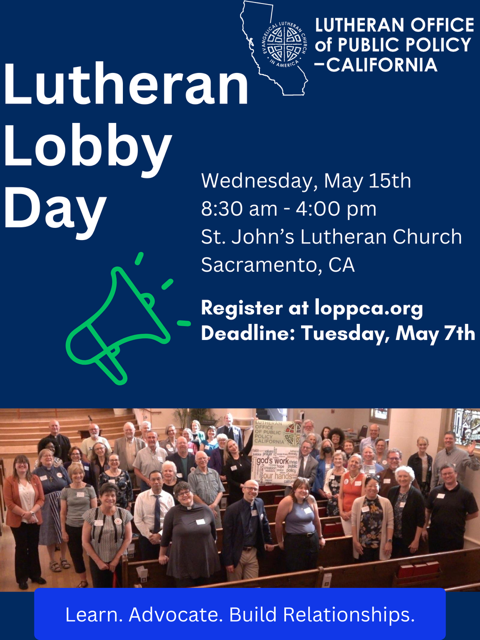 Learn. Advocate. Build Relationships. This is the theme of Lutheran Lobby Day 2024, held in Sacramento on Wednesday, May 15th. There is still time to register at https://lutheranpublicpolicyca.org/lutheran-lobby-day-2024, but the deadline of Tuesday, May 7th is fast approaching. The speaker this year will be Sister Michelle Gorman, California state Senate Chaplain, and the full schedule can be found here. Southern California is usually less represented at Lobby Day, so please consider whether you can spend a day in Sacramento advocating for environmental justice, poverty reduction, and affordable housing for the most vulnerable Californians. Specific bills will be finalized close to Lobby Day depending on thier status in the legislature. | | |