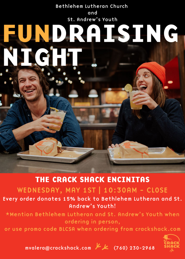 Crack Shack will donate 15% of your meal tab to the youth’s summer service trip. Share the flyer with neighbors! Be sure to mention Bethlehem Lutheran when you order or use the promo code "BLCSA" when ordering online. The youth hope to see you there!