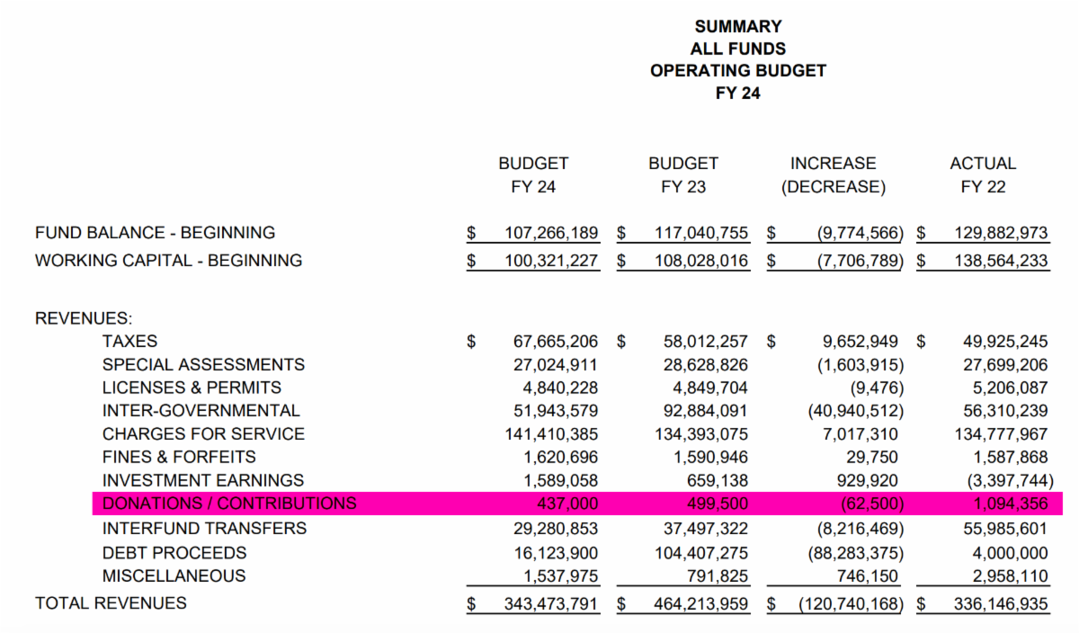 This year, the City budgeted for $437,000 of donations/contributions. And in fiscal years 22 and 23 brought in $1,094,356 and $499,500 respectively.