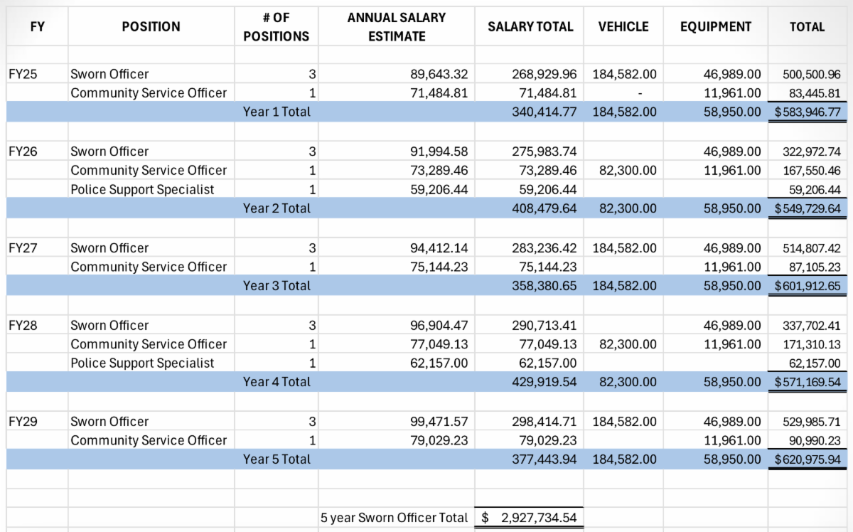 Tomorrow night, the Billings Police Department (BPD) will present its budget proposal of $33.5 million with most of the funding, almost $26 million, going to salaries and benefits for staff. The budget presentation also includes a schedule for increasing officers over the next 5 years, starting by adding 4 FTEs in FY2025, 3 sworn officers and a Community Service Officer capable of processing crime scenes, taking statements, and filing reports. The four additions take the authorized total staffing of Billings Police Department to 168 sworn officers, 41 support personnel, and seven animal control employees. | |