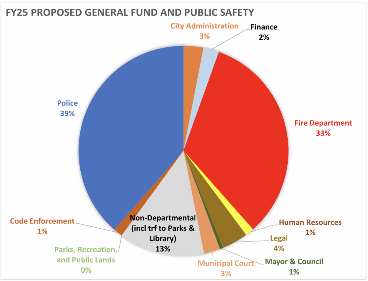 The General Fund, which provides funding for police, fire, administrative, and finance departments (among others), appropriates $84 million of the almost half a billion dollar budget—the vast majority of which goes to our police and fire departments.