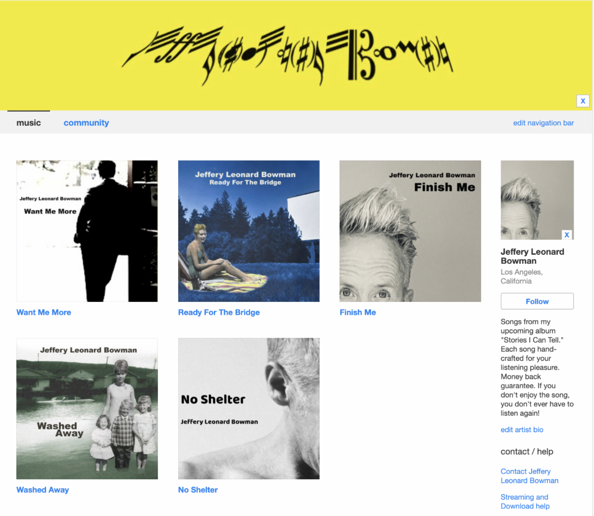 * For Spotify, Apple Music, Amazon Music, Pandora and all the others, just type in the search box- JEFFERY LEONARD BOWMAN and make sure to spell my first name right. All four current songs- "No Shelter," "Finish Me" and "Ready For The Bridge" and "Washed Away" are all there just waiting for someone to listen and say "Hey! That Bingo Boy can actually sing!"
