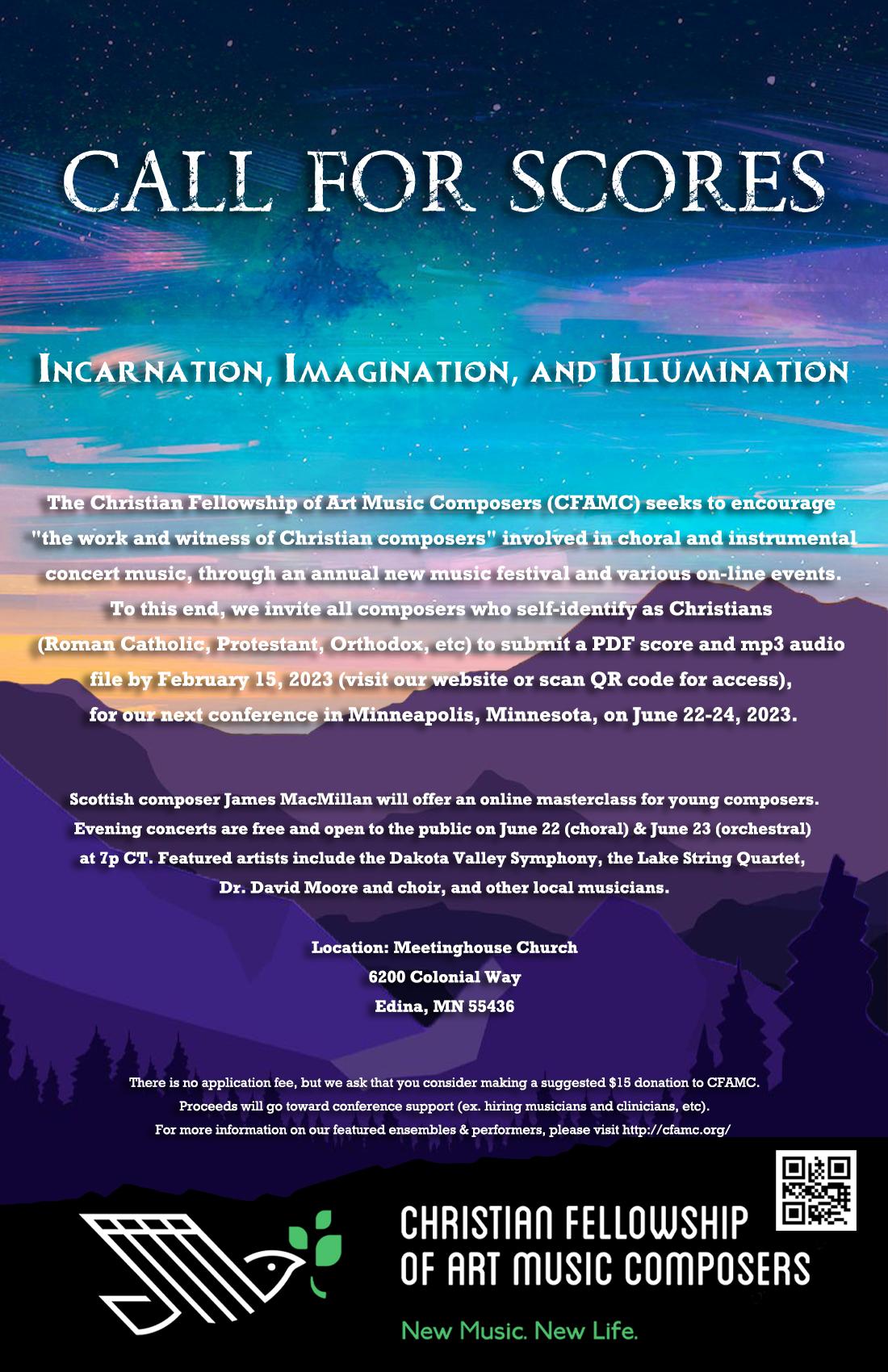 HPN is proud to announce the national music ministry: Christian Fellowship of Art Music Composer's next conference. This is an event involving an organization that is part of ASCAP/BMI (etc), and there is a great lineup of ensembles. The purpose is to foster fellowship among students and among professionals who are Christians. If you want to find out more about it or send in a new original score to their competition.