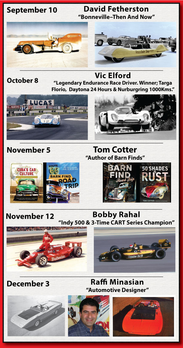 Our Fall Speaker Series events continue with; legendary endurance race car driver Vic Elford on Saturday, October 8; Indy 500 Winner and Three Time Indy series Champion Bobby Rahal on Saturday, November 12; Historian, author and Barn Find hunter, Tom Cotter on Saturday November 5, and designer Raffi Manassian on Saturday, December 3. Events start at 10:30 am and